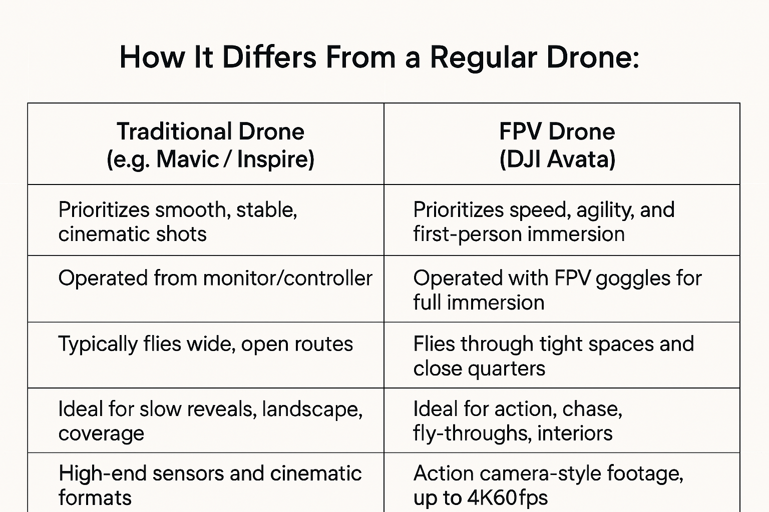 Unlike traditional drones designed for smooth, cinematic overheads, FPV (First Person View) drones fly low, fast, and tight — ideal for weaving through architecture, chasing subjects, or adding energy and movement to branded content and commercials.
